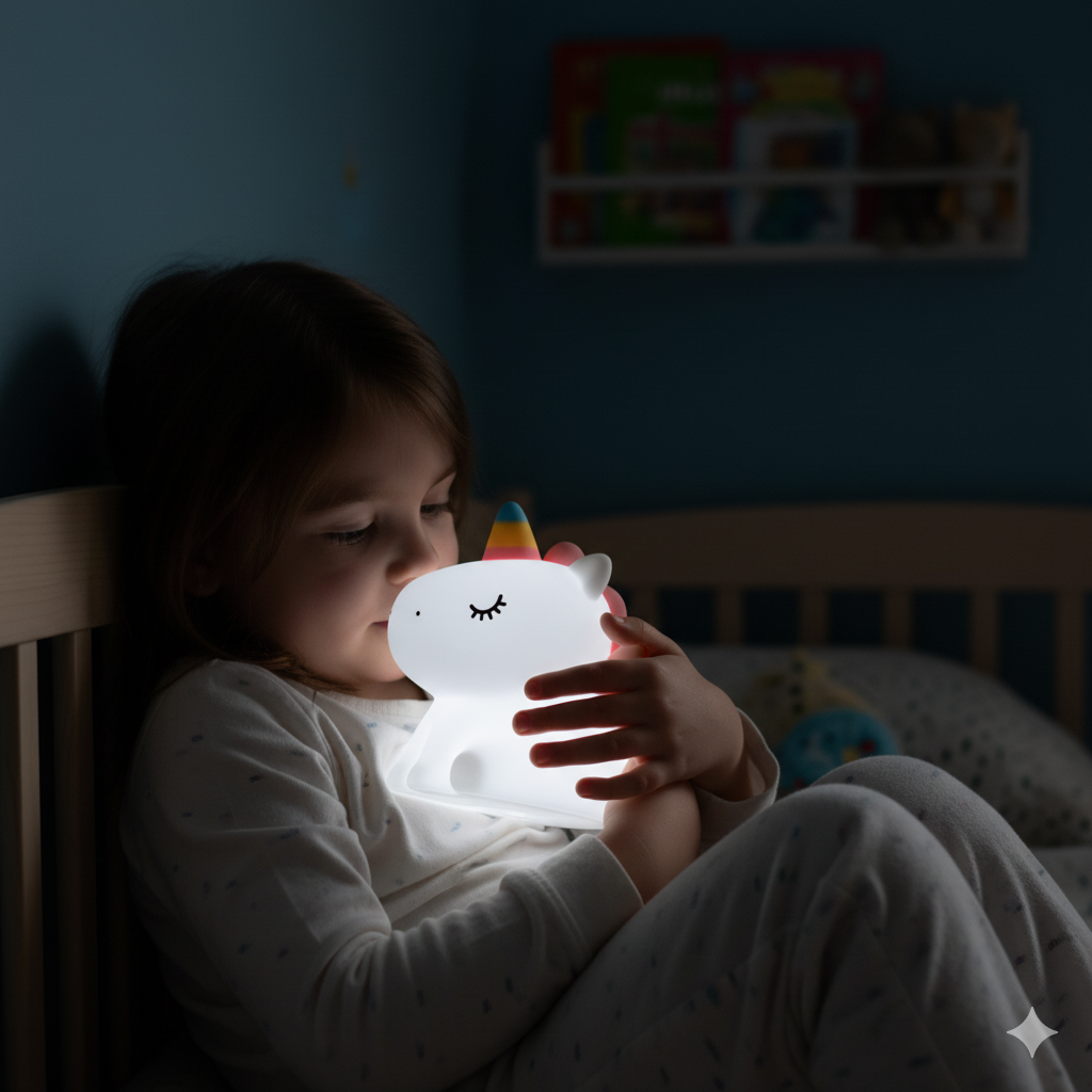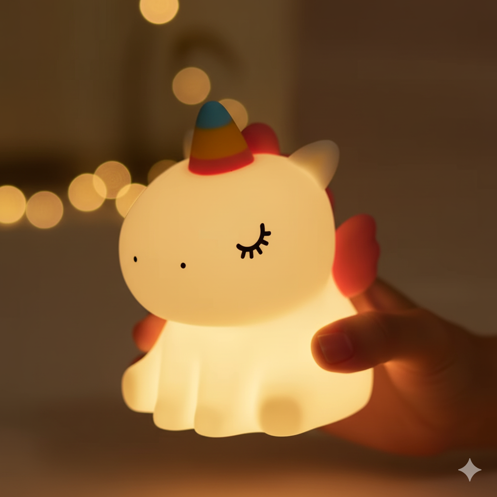 The Unicorn Night Light creates a warm glow that helps children feel safe and fall asleep faster. Made of soft silicone—safe for little hands to hold and snuggle with.